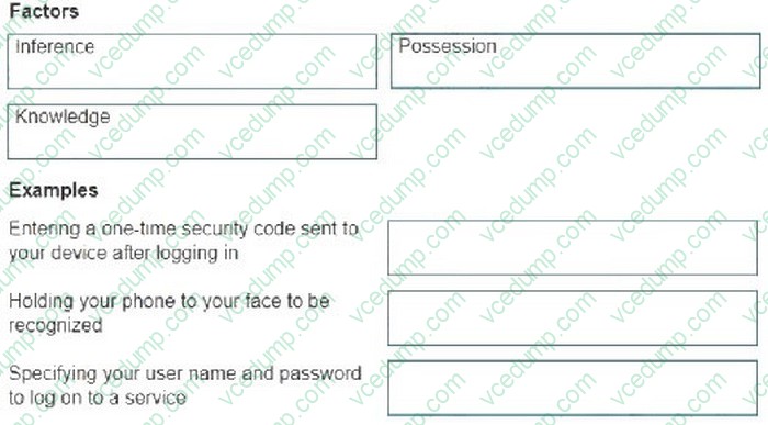 Move the MFA factors from the list on the left to their correct examples on the right. You may use each factor once, more than once, or not at all.