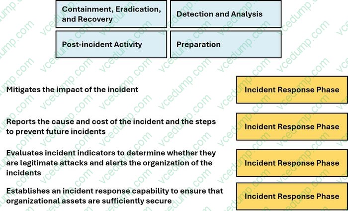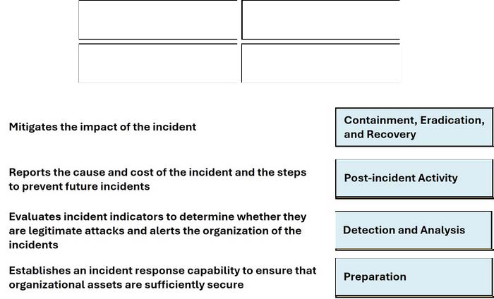 Move each NIST Incident Response Lifecycle phase from the list on the left to the correct description on the right.