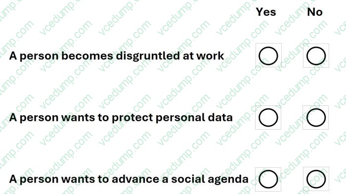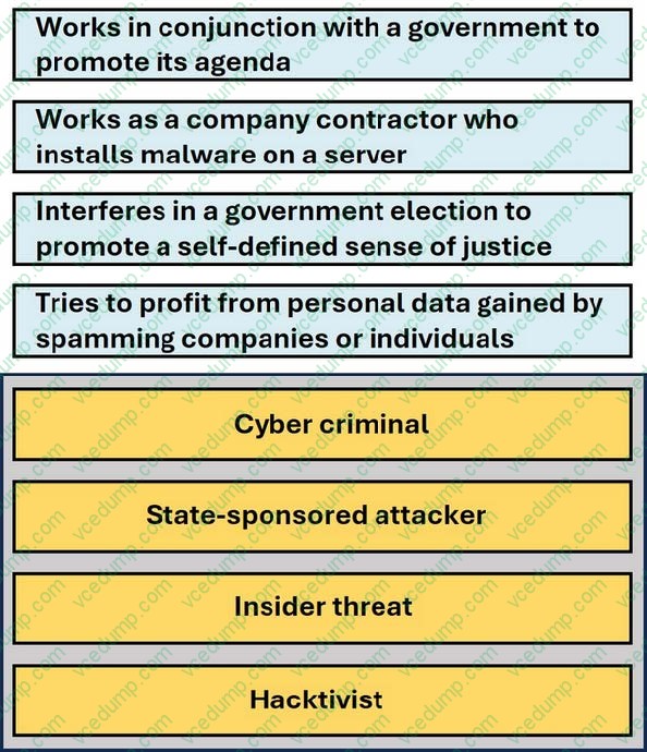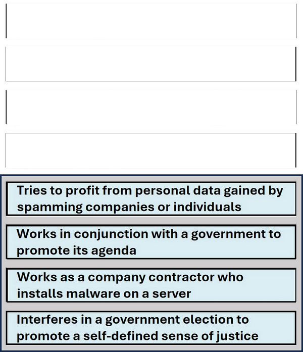 Move each scenario from the list on the left to the correct type of attacker on the right.