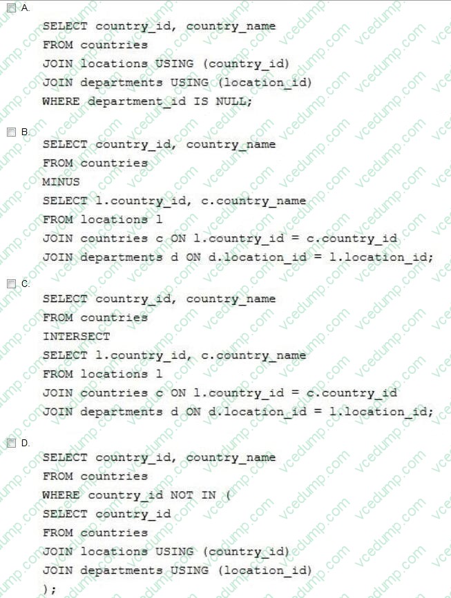 Which two queries will return a list of countries with no departments? (Choose two.)
