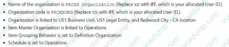 Name of the organization is PRCXX Organization (Replace xx with 01, which is your allocated User ID.) Organization code is PRCXXORG (Replace xx with 01, which is your allocated User ID.) Organization is linked to US1 Business Unit, US1 Legal Entity, and Redwood City - CA location Item Master Organization is linked to Operations Item Grouping Behavior is set to Definition Organization Schedule is set to Operations