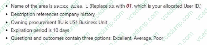 Name of the area is PRCXX Area 1 (Replace xx with 01, which is your allocated User ID.) Description references company history Owning procurement BU is US1 Business Unit Expiration period is 10 days Questions and outcomes contain three options: Excellent, Average, Poor