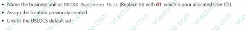 Name the business unit as PRCXX Business Unit (Replace xx with 01, which is your allocated User ID.) Assign the location previously created Link to the USLOCS default set