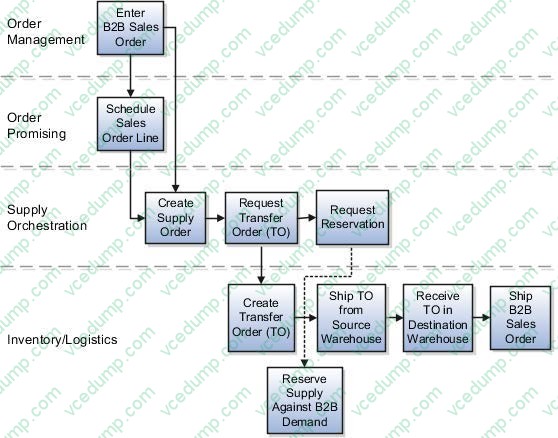 The supply document for a back-to-back transfer flow is a transfer order. The transfer order is created in inventory and reserved against the back-to-back sales order. When the transfer order is ready to be fulfilled, an interorganization shipment moves goods from the source organization to the destination organization. An interorganization receipt in the destination organization (which is also the fulfillment warehouse on the back- to-back sales order) creates on hand to fulfill the sales order.