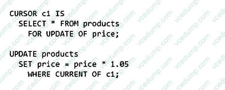 A. The lock acquired when executing the OPEN c1 command will be released only after a COMMIT or ROLLBACK statement is issued. B. Only the PRICE column can be updated in the PRODUCTS table. C. The FOR UPDATE OF clause can be used only if the WHERE CURRENT OF clause is used in the executable part of the block. D. The WHERE CURRENT OF clause can be used only if the FOR UPDATE clause is used in the cursor definition. E. An OPEN c1 command will acquire a lock only on the PRICE column in the PRODUCTS table.