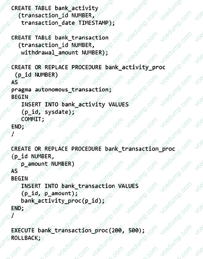 A. Neither table will have a row inserted and committed. B. Both tables will have a row inserted and committed. C. The transaction for the bank_activity_proc is independent of the bank_transaction_proc. D. The bank_activity_proc will not compile because of the commit. E. Only one table will have a row inserted and committed.