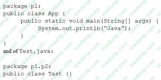 A. The App.class file is stored within the p1 folder. The Test.class file is stored within the p2 sub-folder of p1.Given: