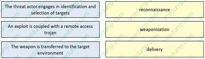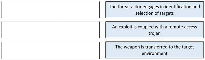Drag and drop the definition from the left onto the phase on the right to classify intrusion events according to the Cyber Kill Chain model.