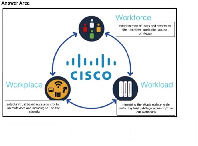 Cisco's Zero Trust Architecture simplifies the Zero Trust journey into three critical areas. Drag the definitions onto the graphic to describe Zero Trust from the Cisco perspective.