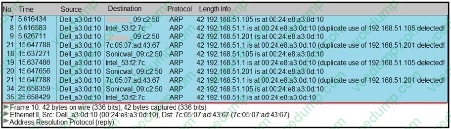 C. ARP spoofing; configure port security explanation: Explanation Explanation/Reference:The exhibit shows multiple ARP reply packets with the same IP addresses (192.168.51.105and192. 168.51.201) being mapped to different MAC addresses , which triggers the message: "duplicate use of [IP] detected". This is a strong indicator of an ARP spoofing (or poisoning) attack. ARP spoofing occurs when a malicious actor sends falsified ARP messages to associate their MAC address with the IP address of another host. This misleads other devices on the network and allows interception or redirection of traffic. The Cisco CyberOps Associate guide specifically recommends configuring port security on switches as a method to mitigate ARP spoofing , by limiting the number of MAC addresses allowed per port or statically assigning legitimate MAC addresses to switch ports.