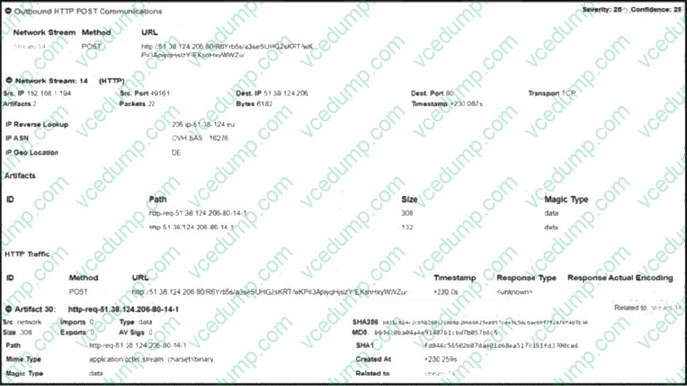A. Destination IP 51.38.124.206 is identified as malicious explanation: Comprehensive and Detailed From the exhibit, Cisco Secure Malware Analytics (formerly Threat Grid) has captured outbound HTTP POST communication to the IP address 51.38.124.206 on port 80. This destination is highlighted in the analysis under "Outbound HTTP POST Communications," indicating exfiltration behavior or command-and- control (C2) signaling. Key indicators: The report shows that binary data was POSTed to this IP. The source system generated 22 packets and sent 6,192 bytes. The system has flagged the behavior with a severity of 25 and confidence of 25--suggesting that this is an IoC worth acting on. Therefore, the artifacts suggest that the destination IP 51.38.124.206 is involved in malicious activity, and the correct answer is: