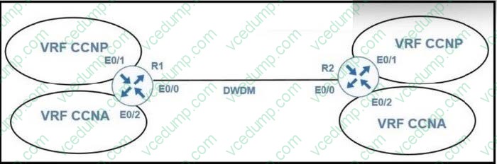 A prefix of 10.1.1.0/31 is assigned for the DWDM circuit between R1 and R2 to connect the two attached VRFs on each router.