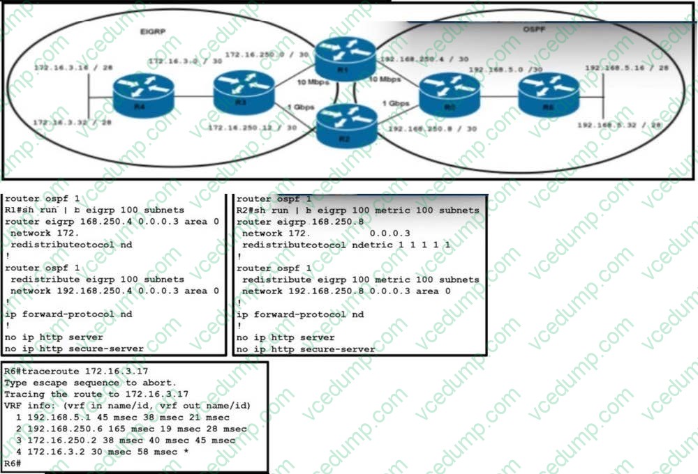 An engineer is troubleshooting suboptimal communication from the 192.168.5.32/28 subnet to the 172.16.3.16/28 segment using the slowest links. Which configuration resolves the suboptimal routing issue?