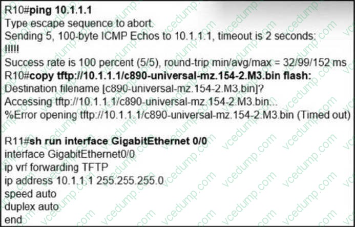 A. Change R10 duplex to auto to resolve the duplex mismatch between routers R10 and R11. B. R10 must be configured to belong to the same VRF TFTP. C. R11 requires the TFTP server source-interface to be set to GigabitEthernetO/0. D. R11 requires the TFTP server command for the image to be set to the VRF TFTP.
