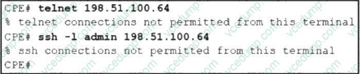 A. Remove the transport output none command from the line con 0 section. B. Remove the egress ACL blocking Telnet and SSH on the router interfaces. C. Move Telnet and SSH commands to a nonzero privilege level. D. Modify the AAA policy to allow the user to run the Telnet and SSH commands.
