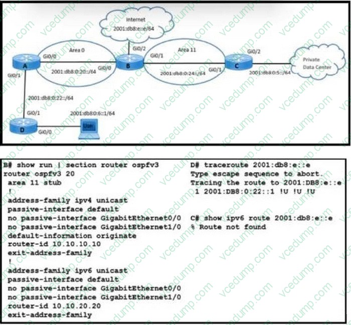 A. Change Area 11 to Area 0 between routers B and C. B. Add a static route for 2001: db8:0:6::1/64 on router B RIB. C. Advertise the 2001:db8: e::e/64 route on the router D OSPF process. D. Enable default information to originate in IPv6 AF on router B.