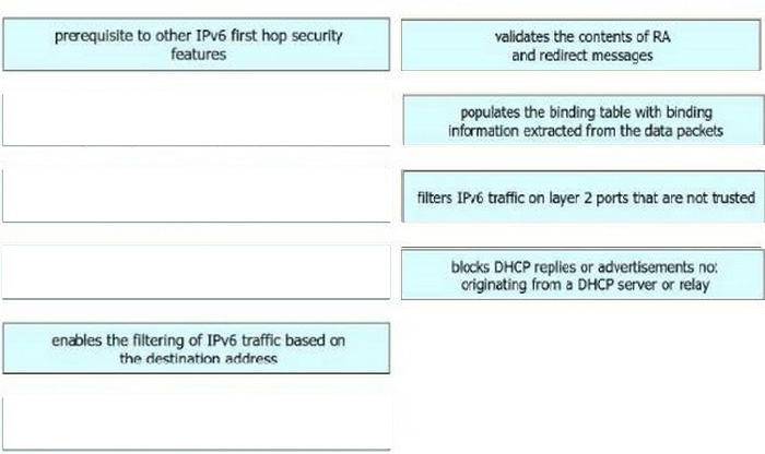 Drag and drop the descriptions from the left onto the IPv6 first hop security features on the right. Not all options are used.