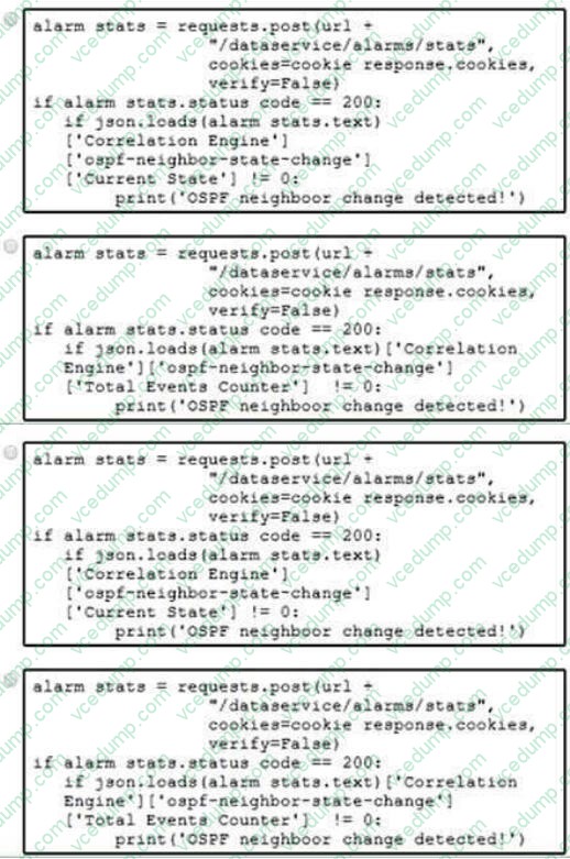 An API request must display an alert message if change in OSPF neighbors is detected. Which code snippet must be added to complete the requests?