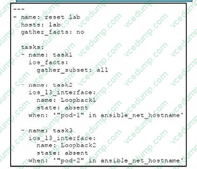 Refer to the exhibit. The lab group consists of four Cisco IOS XE routers named pod-11,pod-12, and pod-22. What is the result of running the Ansible playbook to reset the lab?