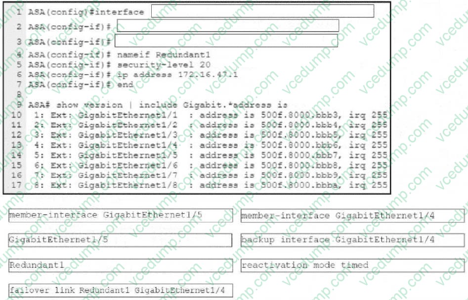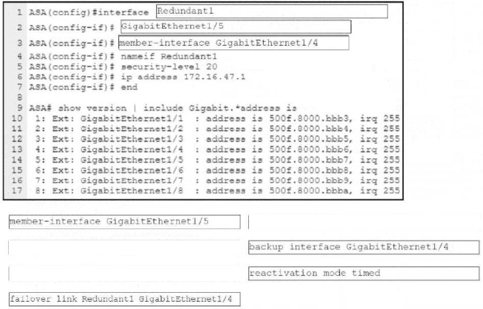 An engineer must configure a connection on a Cisco ASA Firewall with a Cisco Secure Firewall Services Module to ensure that the secondary interface takes over all the functions of the primary interface if the primary interface fails. Drag and drop the code snippets from the bottom onto the boxes in the CLI commands to configure the failover. Not all options are used.