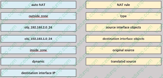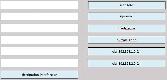 An engineer configures a NAT rule allowing clients to use the internet only if clients are located on the directly connected internal network. Dynamic auto PAT must be configured. Drag and drop the NAT rules from the left onto the corresponding targets on the right. Not all options are used.