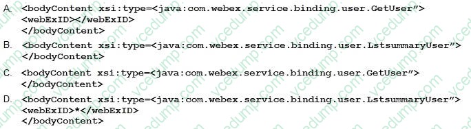 Refer to the exhibit. Alice is a Webex Meetings admin for her organization. Which code snippet completes a Webex Meetings XML API request that returns all users?