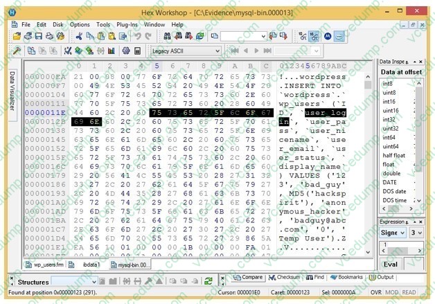 A. Source code reviewAnalyze the hex representation of mysql-bin.000013 file in the screenshot below. Which of the following will be an inference from this analysis?