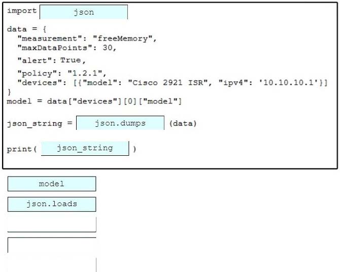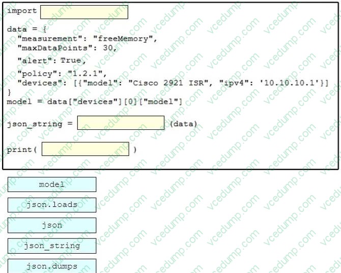 Drag and drop the code snippets from the bottom onto the blanks in the Python script to convert a Python object into a JSON string. Not all options are used.