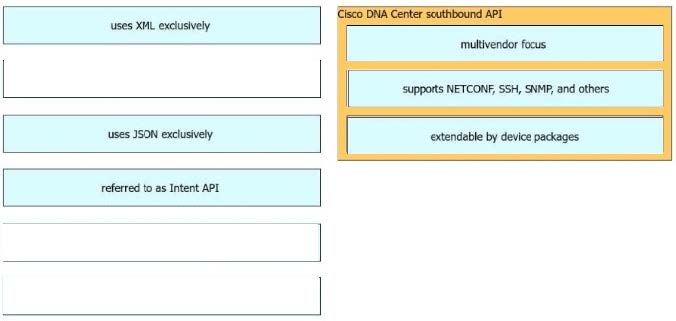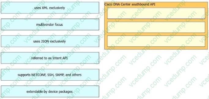 Drag and drop the Cisco Catalyst Center (formerly DNA Center) southbound API characteristics from the left to the right. Not all options are used.