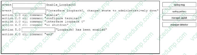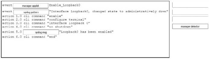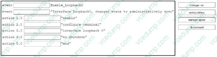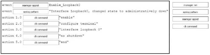 Drag and drop the command snippets from the right onto the boxes to create an EEM applet that will enable interface LoopbackO when the logging message 'Interface LoopbackO. changed state to administratively down" is received. Not all commands are used and some commands are used more than once.