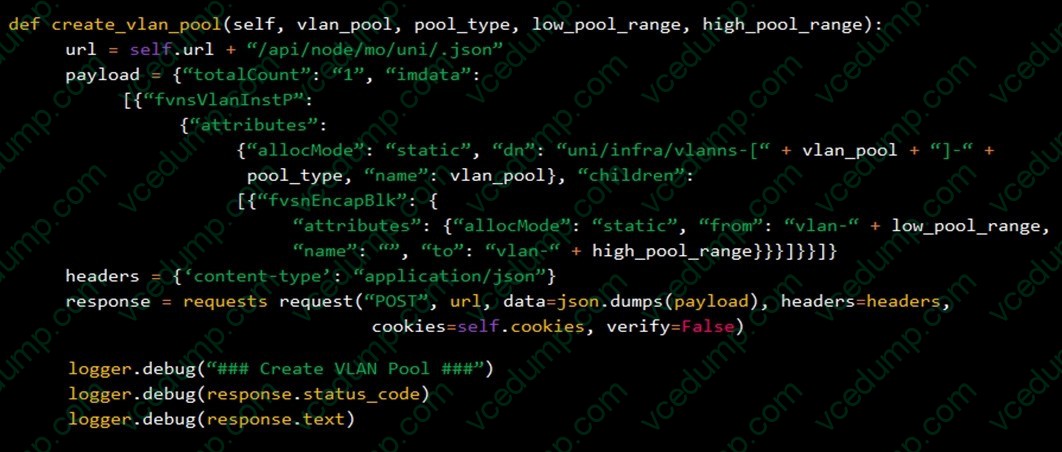 The purpose of this Python function definition is to create VLAN pools on ACI solution. Which statement is true?