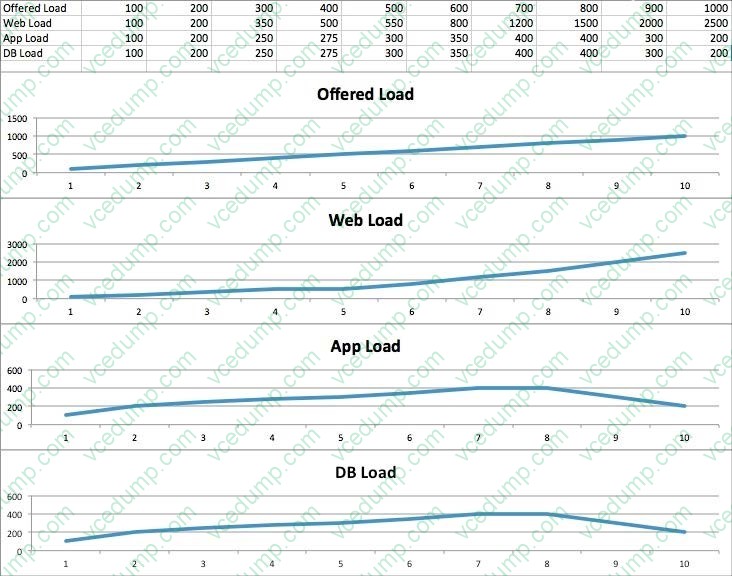 A. The Web tier is the bottleneck because it has the most open requests waiting for a response. B. The DB tier is the bottleneck because it is the lowest tier that is clearly not handling requests in time. C. The App tier is the bottleneck because it is the first tier not handling the same number of requests as the tier above it. D. The Web tier is the bottleneck because at an Offered Load of 300, there are still 50 requests waiting from the Web tier, and it never recovers. The lower tiers do not get the requests passed to them because the Web tier is not processing fast enough. E. The App tier is the bottleneck because the DB tier is handling everything the App tier sends it.