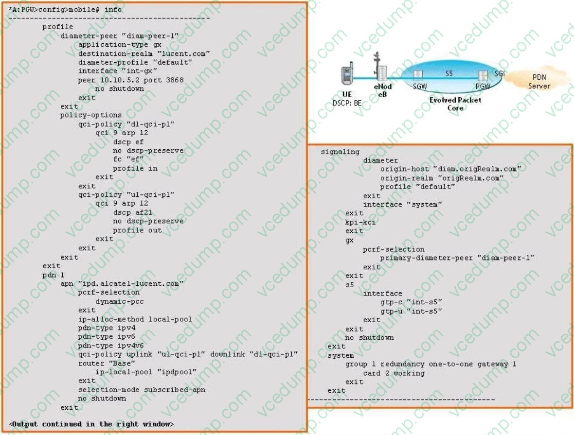 A. The PGW terminates the IP sessions from a UE.A UE is exchanging best-effort (BE) IP traffic with a PDN server over an EPS bearer with a QCI/ARP value of 9/12. Based on the information shown in the exhibit, what is the DSCP value of traffic egressing the S5 interface of the PGW to the SGW?