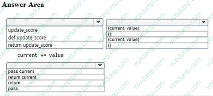 You need to create a function that meets the following criteria: The function is named update_score The function receives the current score and a value The function adds the value to the current score The function returns the new score
