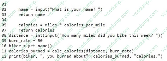 The ABC company is creating a program that allows customers to log the number of miles biked. The program will send messages based on how many miles the customer logs. You create the following Python code. Line numbers are included for reference only.
