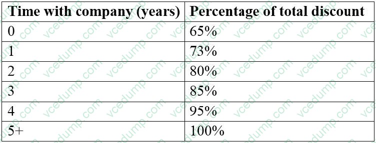 The percentage of the maximum possible discount available to the customer is adjusted based on time with the company: