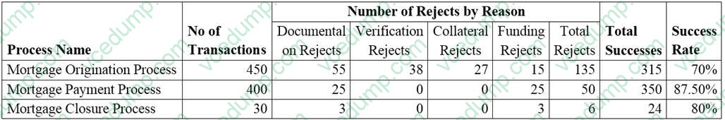 ?Each business process has a certain number of rejects and the reasons for rejection include documentation, verification, collateral, and funding. Funding rejects occur when the bank's customers have failed to make payment of their