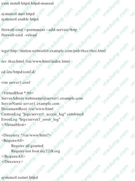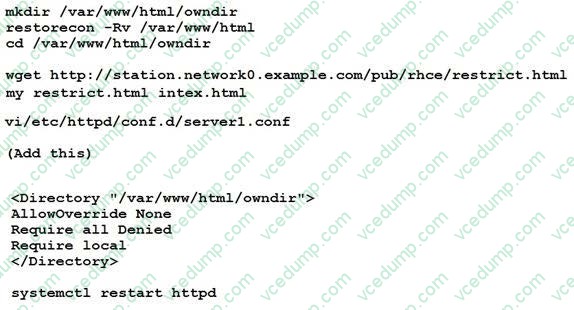 There were two systems: system1, main system on which most of the configuration take place system2, some configuration here Webpage content modification. Implement website for http://serverX.example.com/owndir Create a directory named as "owndir" under the document root of webserver Download http://station.network0.example.com/pub/rhce/restrict.html Rename the file into ondex.html The content of the owndir should be visible to everyone browsing from your local system but should not be accessible from other location