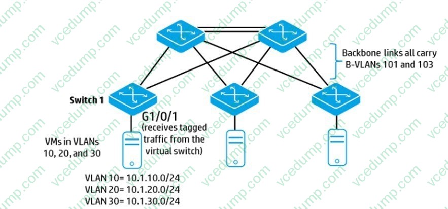 SPBM is being implemented on the backbone links shown in the exhibit. The servers in VLAN 10 (10.1.10.0/24) should be able to communicate at Layer 2 across the backbone. In the vsi section of the configuration on Switch 1. which logical