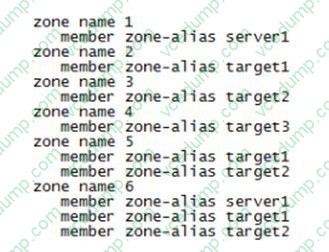 An HP Comware switch is configured to support FCoE in Fibre Channel Forwarder (FCF) mode. Serverl should be able to discover storage targetl and target2. but not target3. Assume that the zone-aliases have been configured to reference the FC devices correctly