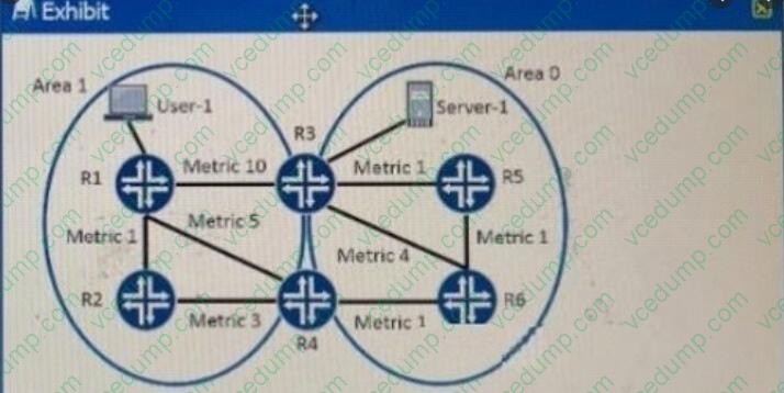 A. MD5Referring to the exhibit, R2 is exporting the route for server1 as a Type 2 external route and R6 is exporting the route for server 1 as a type 1 external route in OSPF. Which path is taken to reach server-1 from user1?