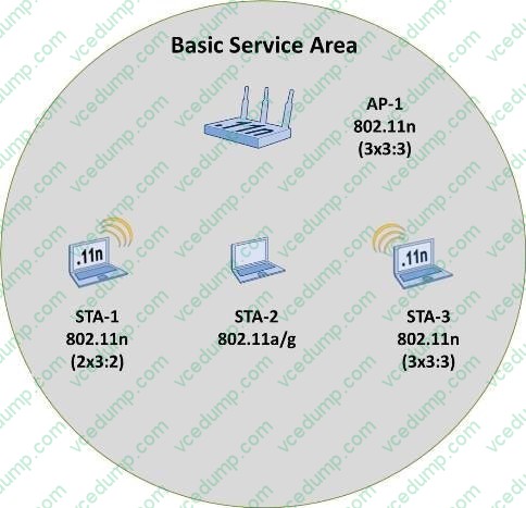 A. One spatial stream, because the BSS must maintain backwards compatibility with STA-2, which supports only 802.11g (ERP) without MIMO or multiple spatial streams. B. Two spatial streams, because the number of spatial streams for an HT-OFDM transmission is limited to the capabilities of the least capable HT station in the BSS. C. Two spatial streams, because the third transmit chain in the HT AP must be used simultaneously for protection mechanisms with the 802.11g (ERP) station. D. Three spatial streams, because HT-OFDM transmissions will be preceded with protection mechanisms using a basic data rate for STA-2 and possibly STA-1.