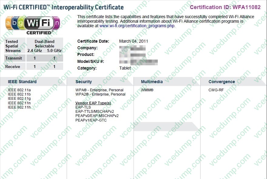Given the Wi-Fi certification shown in the exhibit, what statement is FALSE about this device?