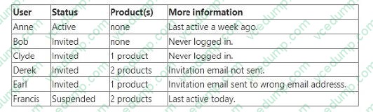 Users who have access to at least one product are considered billable. In this case, Clyde, Derek, Earl, Francis, and Anne are billable users. Bob is not billable because he has not accepted the invitation to join the organization. References = [Manage users and user tiers] and [Control how users get access to products]