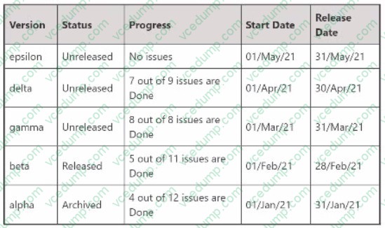 epsilon, delta, and gamma. These are the three unreleased versions in the project, as shown in the image. The versions panel only shows unreleased versions, as they are used to plan and track the progress of upcoming releases. Released