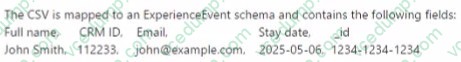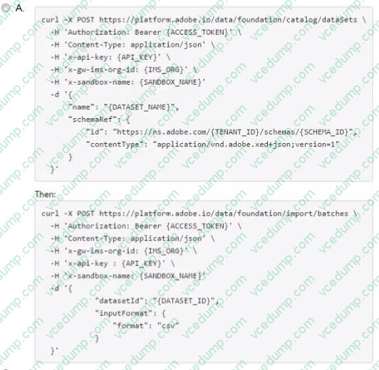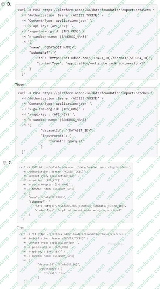 A. Createone schema (schema A) using the Experience Event Schema as the XDM class for the Book a Training Session Event Create out schema (schema B> using individual Profile as the XDM class for the Training Session Metadata Usethe Member ID as the primary identity of the schema A Use the Session ID as a relationship fieldon schema A Use the Session ID as the primary identity of theschema B Enable schema A for profileA data engineer does not have access to the AEP Ul and must create a new Dataset and upload CSV data.