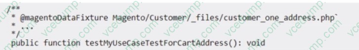 A. Change the annotation to Use@magentoApiDataFixture Magento/Customer/_files/ instead Or dmagentoDataFixture Magento/Customer/_files/customer_one_address.phpNowadays, the certification exams become more and more important and required by more and more enterprises when applying for a job. But how to prepare for the exam effectively? How to prepare for the exam in a short time with less efforts? How to get a ideal result and how to find the most reliable resources? Here on Vcedump.com, you will find all the answers. Vcedump.com provide not only Adobe exam questions, answers and explanations but also complete assistance on your exam preparation and certification application. If you are confused on your AD0-E722 exam preparations and Adobe certification application, do not hesitate to visit our Vcedump.com to find your solutions here.