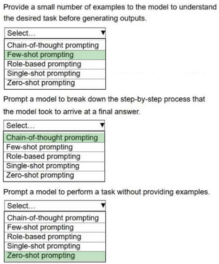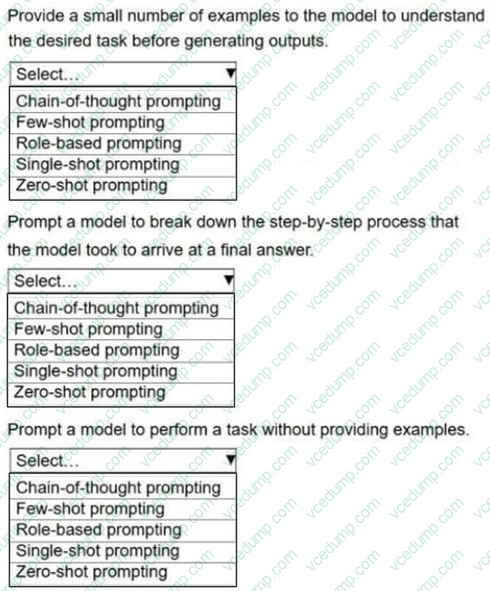 Select the correct prompt engineering technique from the following list for each description. Select each prompt engineering technique one time or not at all.