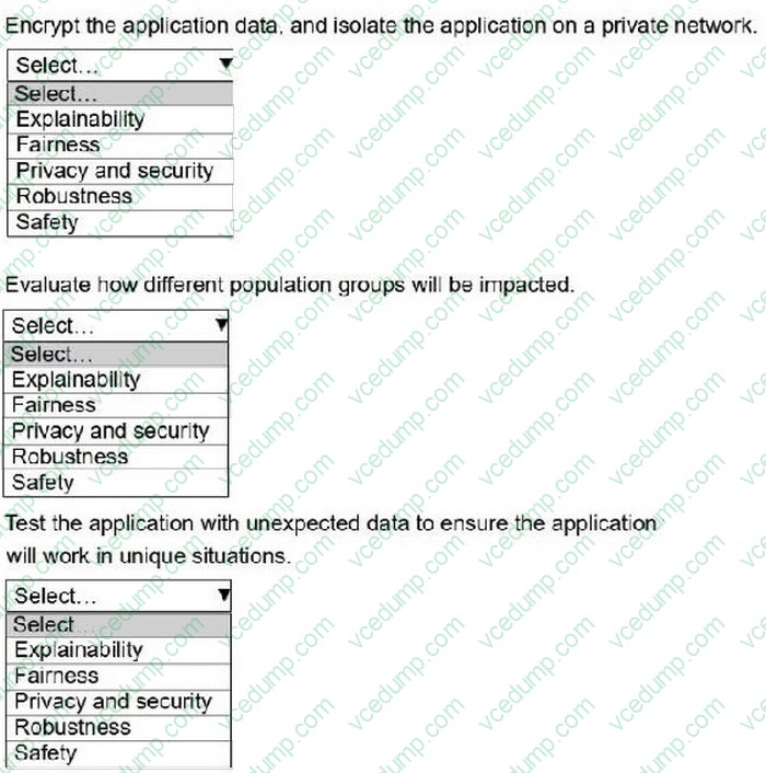 Select the correct responsible AI principle from the following list for each action. Select each responsible AI principle one time or not at all.