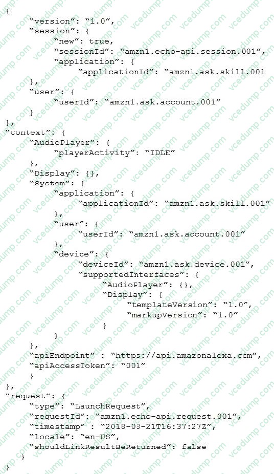 A. Use Amazon CloudWatch to check the most recent execution log and see if an error is present.An Alexa Skill Builder wants to customize a welcome back message for each person who uses the skill. The JSON input is shown below: Which element from the request would the Builder use to accomplish this?